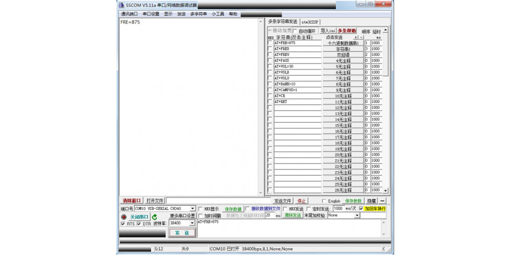 Example: PC serial port assistant sends AT+FRE=875 (sets the receiving frequency to 87.5MHZ ), and the module returns the current frequency FRE=875 as shown below.